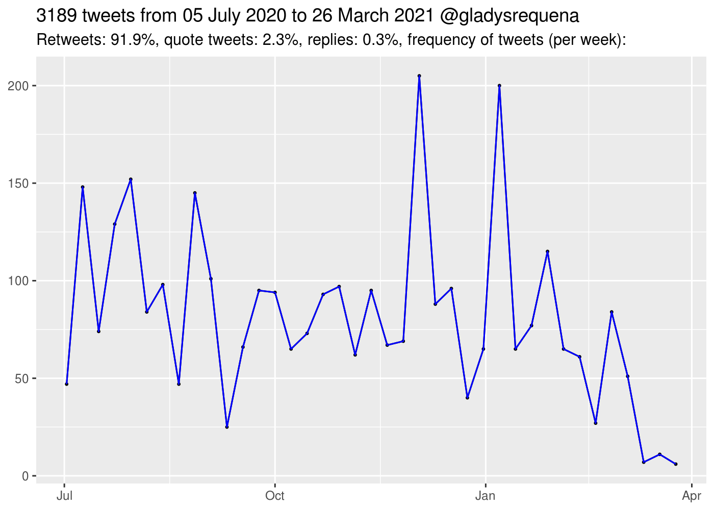 The time period for further statistics is the same as in the graph above. Retweets are included. For the word cloud, the most common words in a language and numbers were eliminated, and words were converted to lowercase.